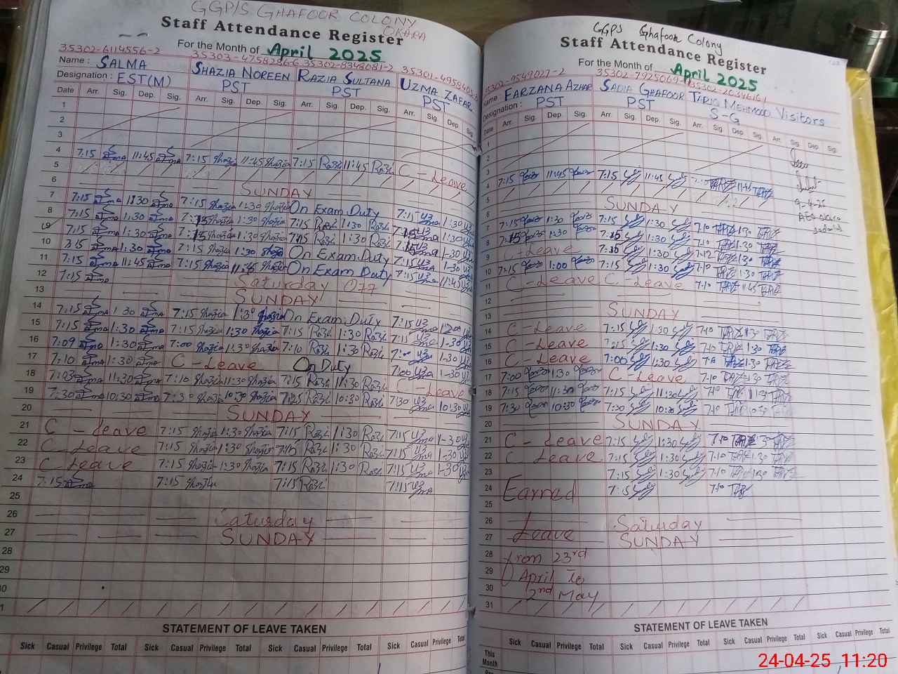 | Leave | Duty | Absent | Maternity | Medical | Ex- Pak |