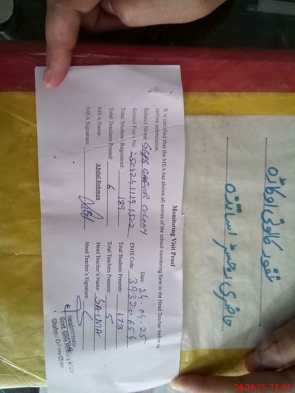 | Attendance Register | Head Teacher | MEA with School | Visit Proof |