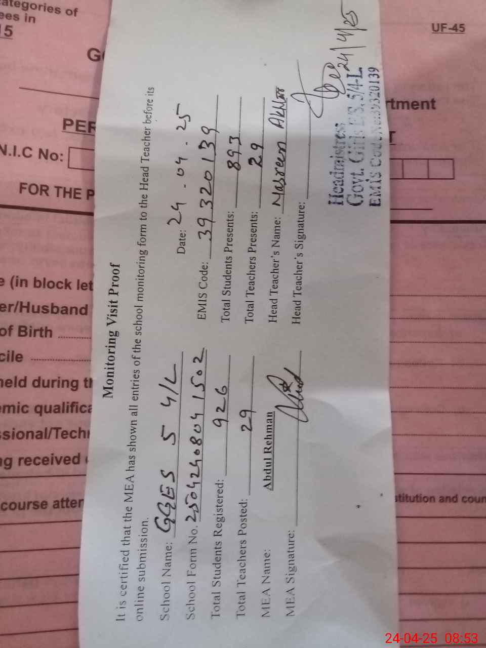 | Attendance Register | Head Teacher | MEA with School | Visit Proof |