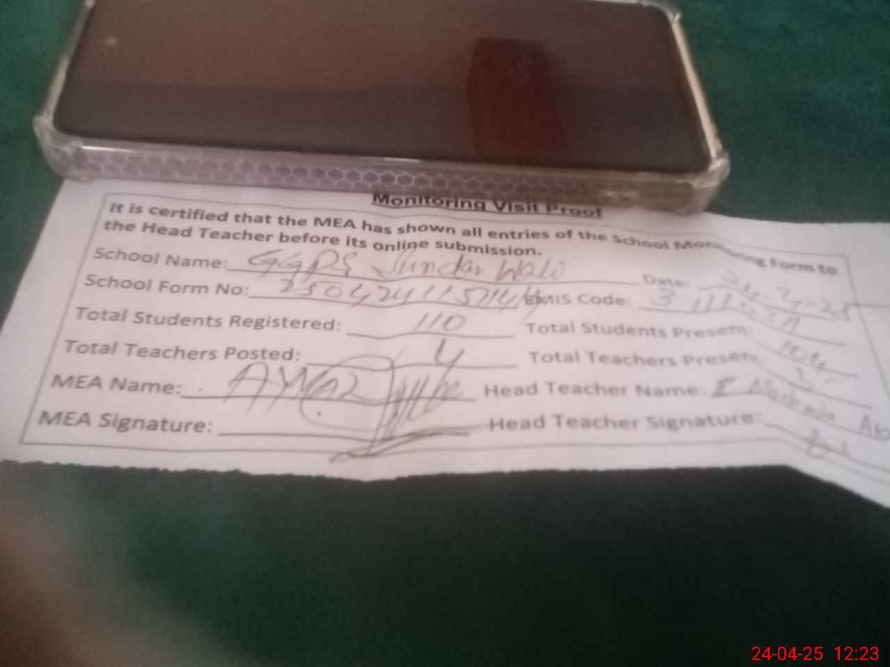 | Attendance Register | Head Teacher | MEA with School | Visit Proof |