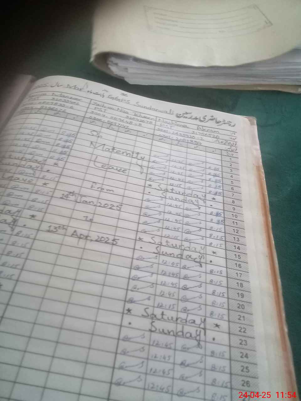 | Leave | Duty | Absent | Maternity | Medical | Ex- Pak |