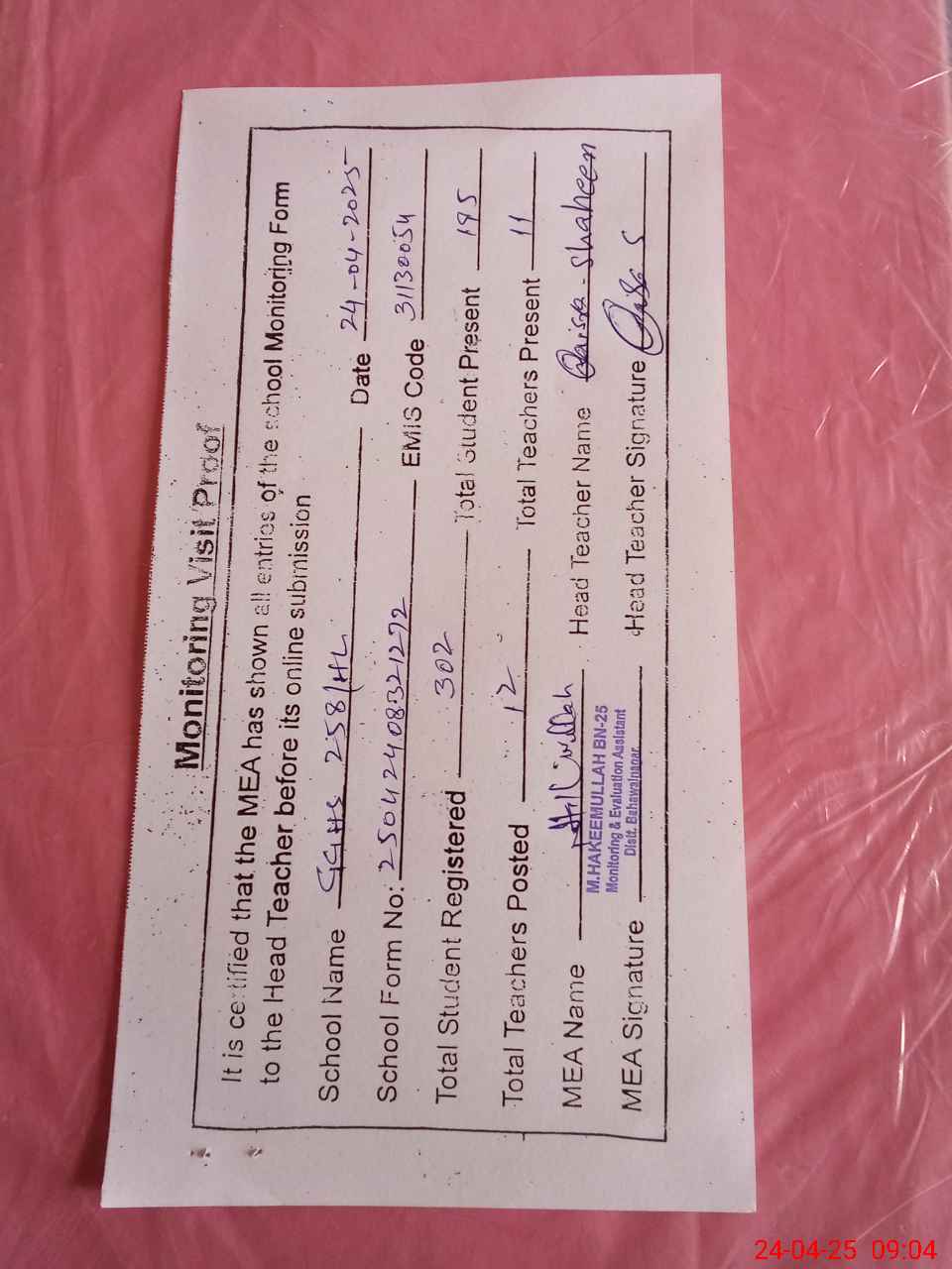 | Attendance Register | Head Teacher | MEA with School | Visit Proof |