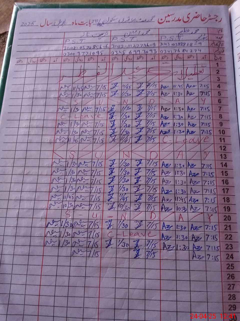| CNIC | Full Name | Designation | R/C | Absence During Last Calender Month |