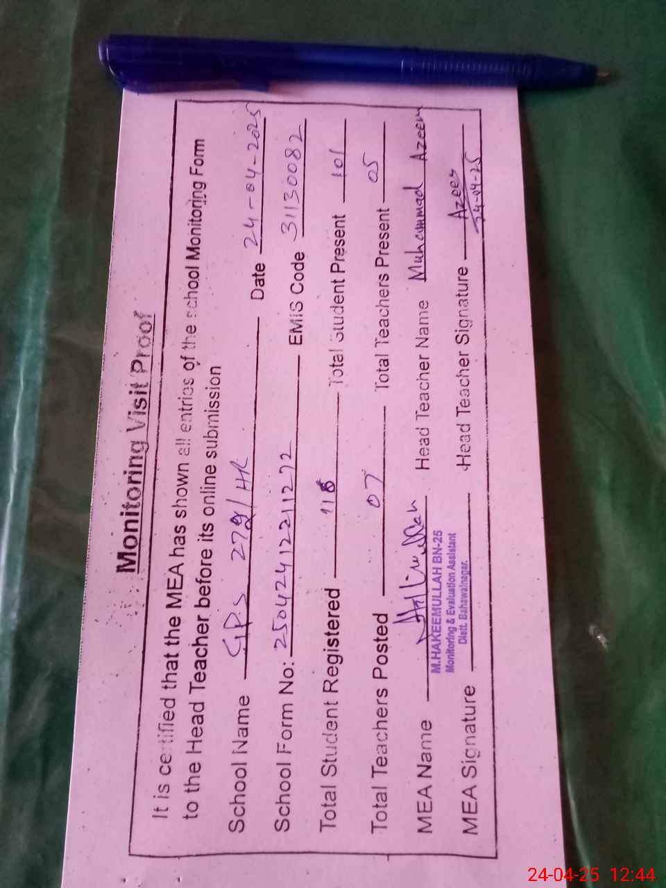 | Attendance Register | Head Teacher | MEA with School | Visit Proof |