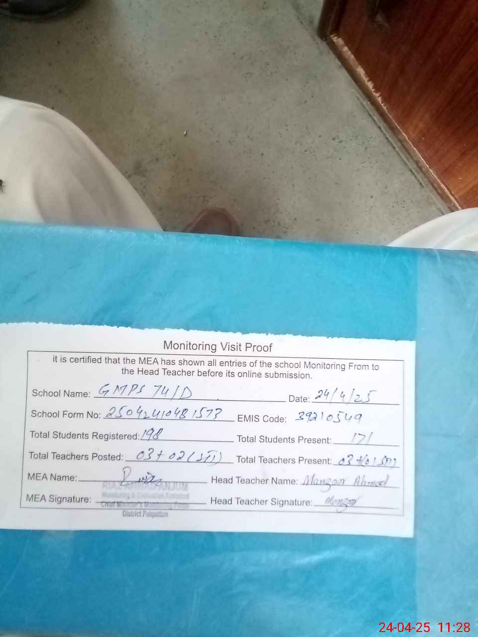 | Attendance Register | Head Teacher | MEA with School | Visit Proof |