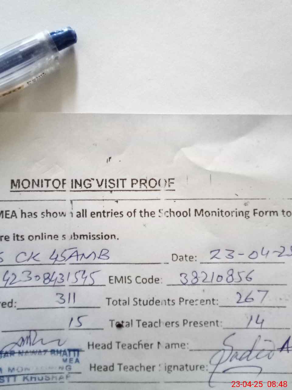 | Attendance Register | Head Teacher | MEA with School | Visit Proof |