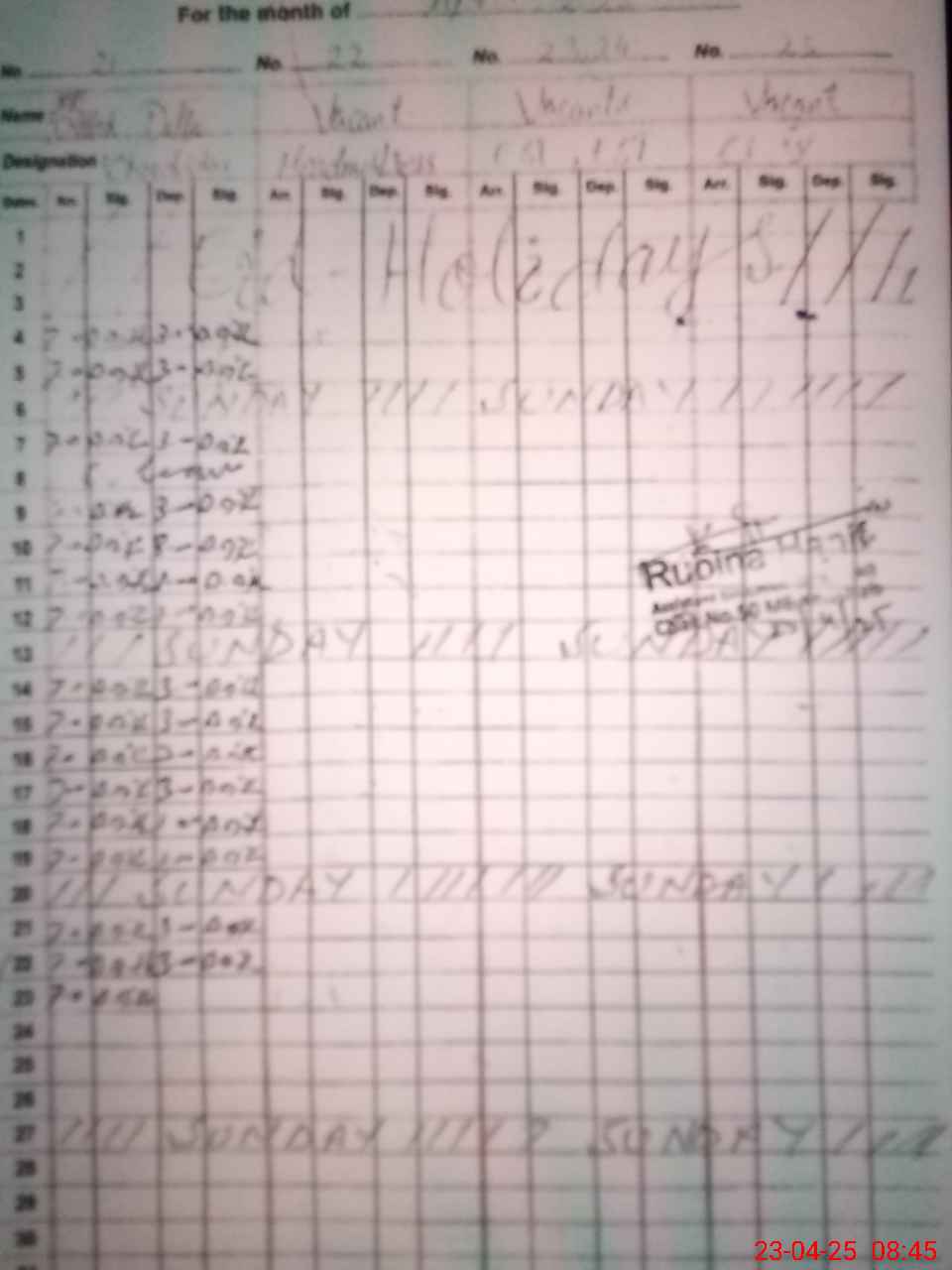 | CNIC | Full Name | Designation | R/C | Absence During Last Calender Month |