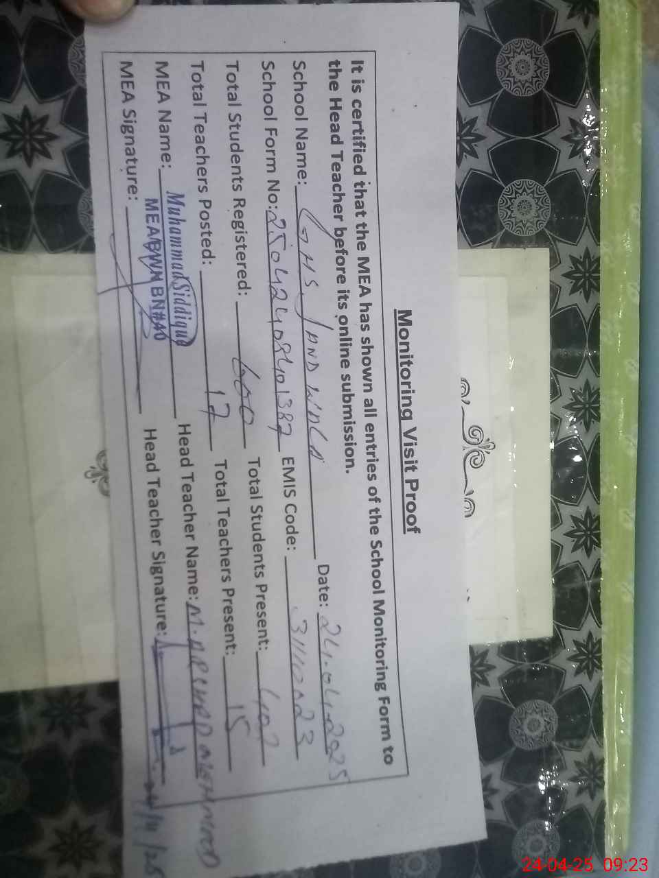 | Certified that this School was Inspected by the Undersigned MEA/DMO Today and the Information Stated Above is as Per Record. | |||||