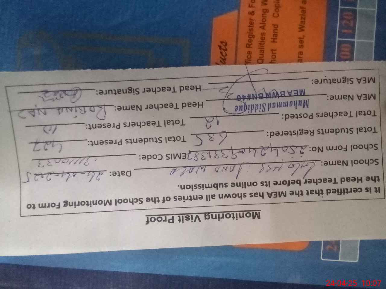 | Attendance Register | Head Teacher | MEA with School | Visit Proof |