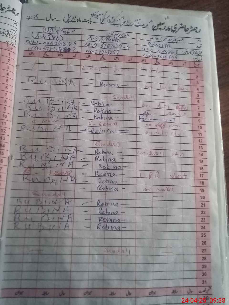 | Leave | Duty | Absent | Maternity | Medical | Ex- Pak |