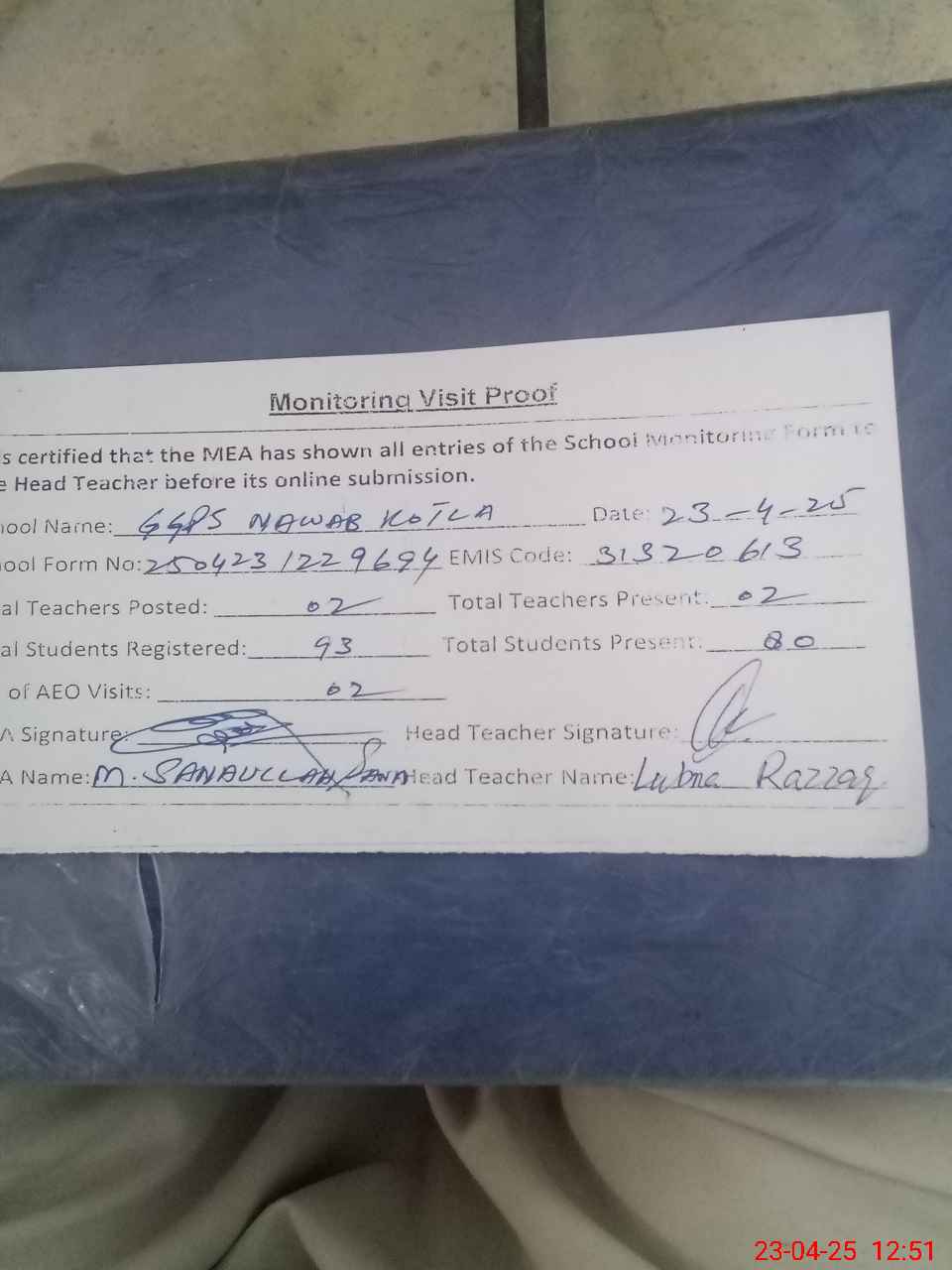 | Attendance Register | Head Teacher | MEA with School | Visit Proof |
