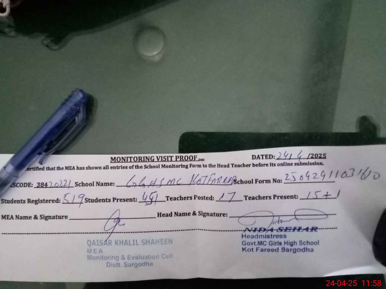 | Attendance Register | Head Teacher | MEA with School | Visit Proof |