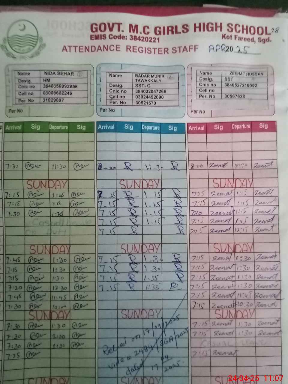 | CNIC | Full Name | Designation | R/C | Absence During Last Calender Month |