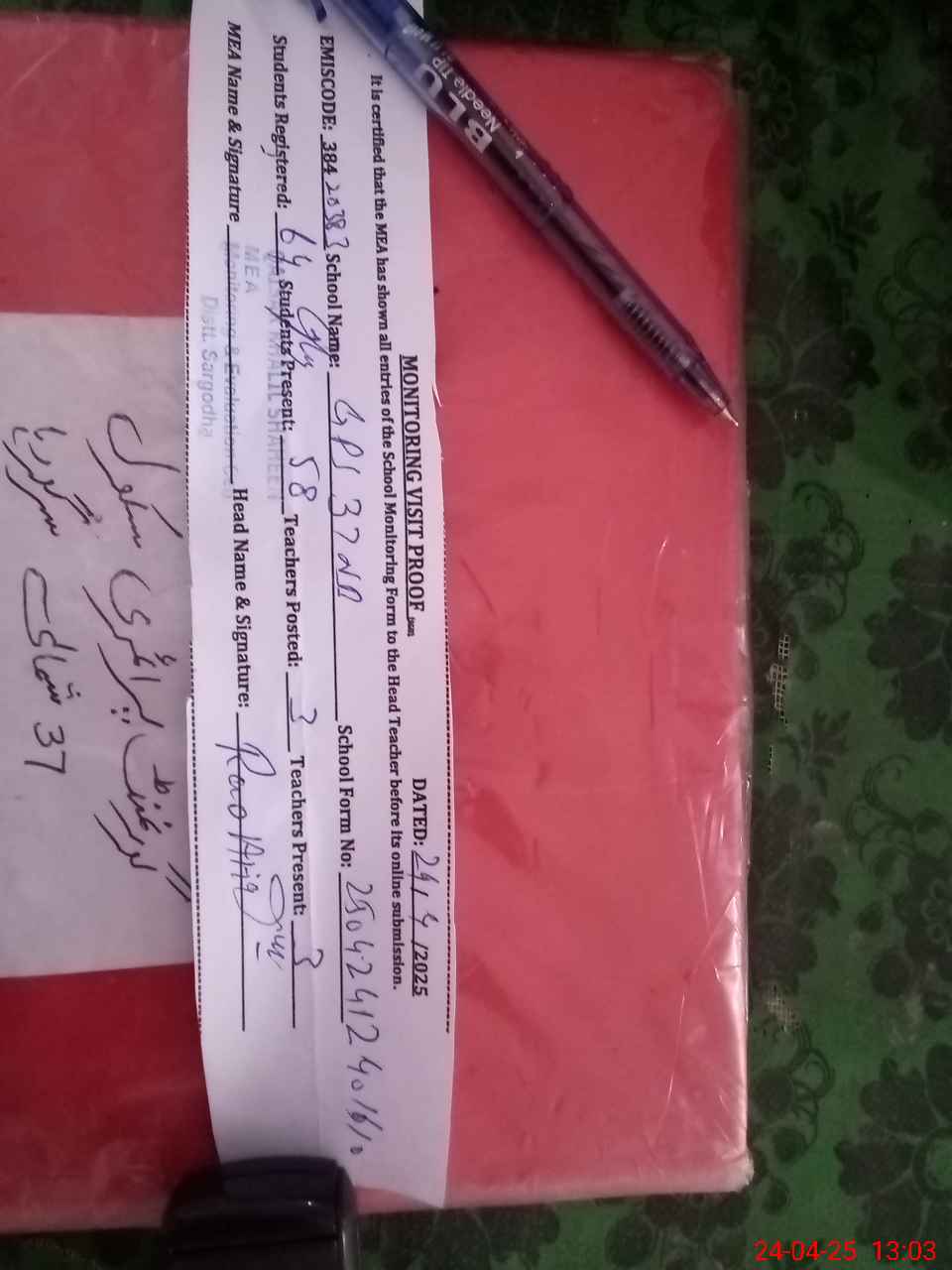 | Attendance Register | Head Teacher | MEA with School | Visit Proof |