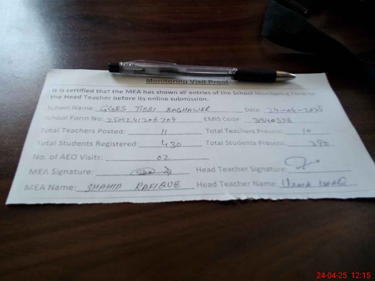 | Attendance Register | Head Teacher | MEA with School | Visit Proof |
