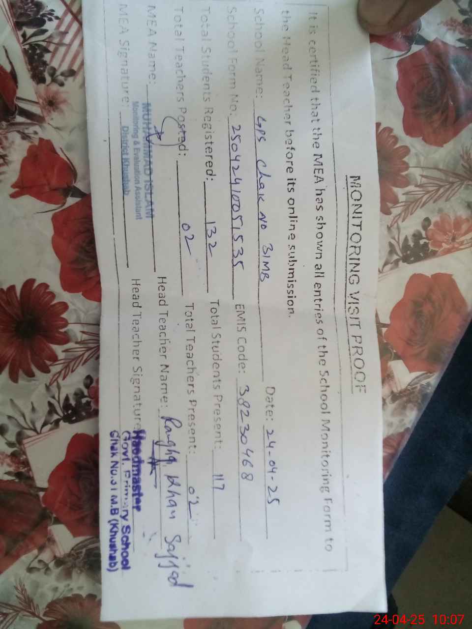 | EMIS Code: 38230468 | Name of School: GPS CHAK NO. 31 MB | |||