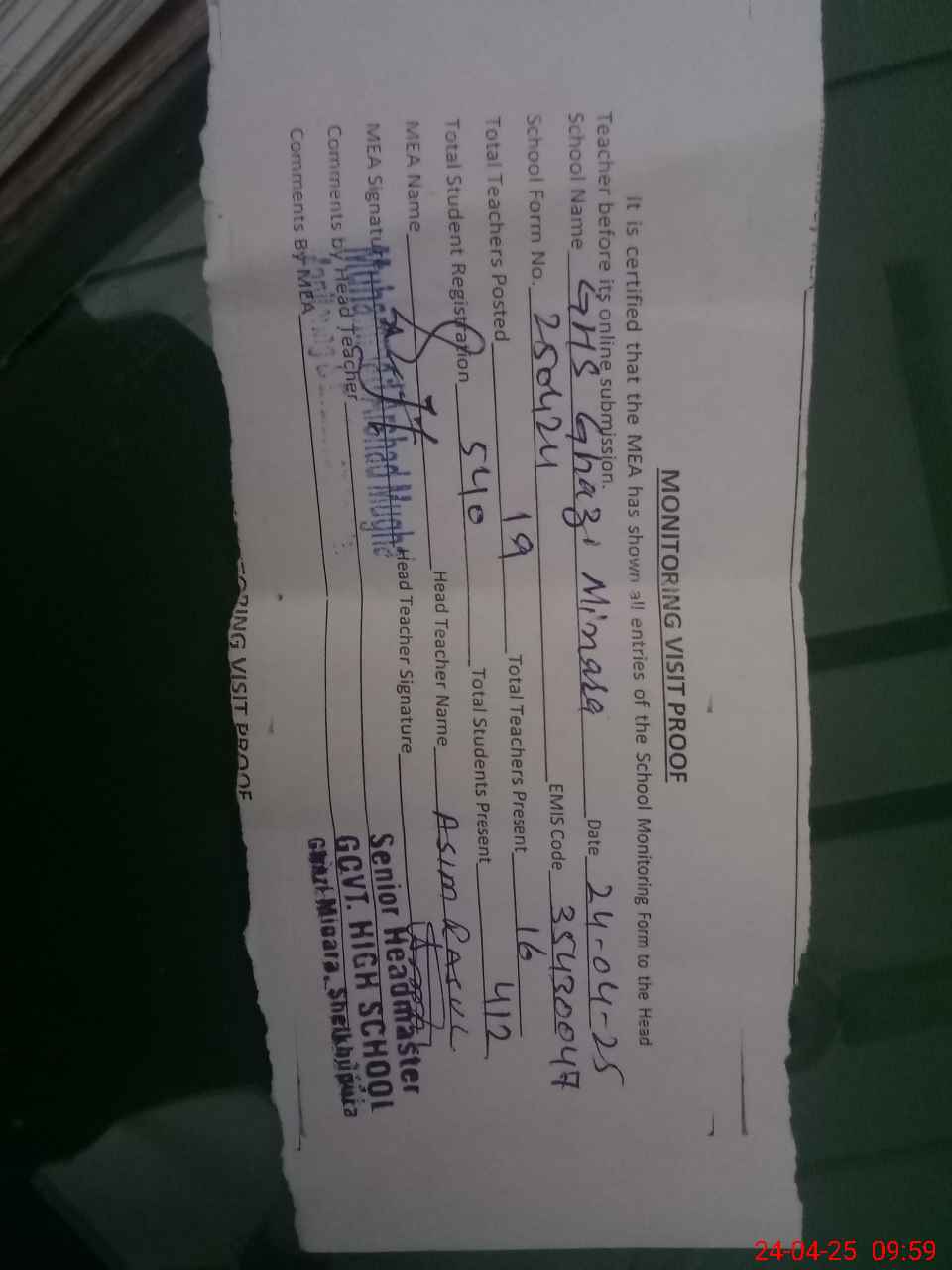 | Attendance Register | Head Teacher | MEA with School | Visit Proof |