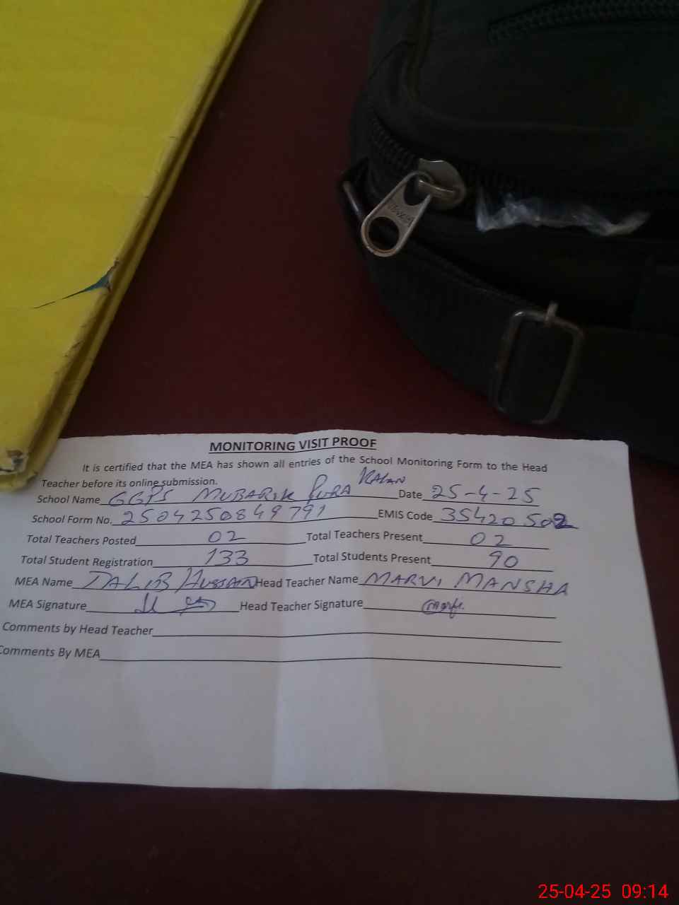 | Attendance Register | Head Teacher | MEA with School | Visit Proof |