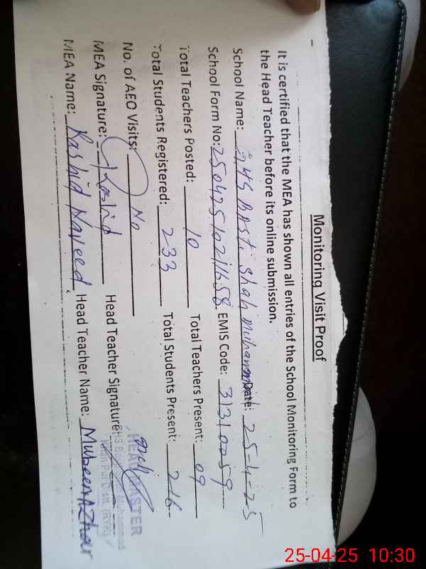 | Certified that this School was Inspected by the Undersigned MEA/DMO Today and the Information Stated Above is as Per Record. | |||||