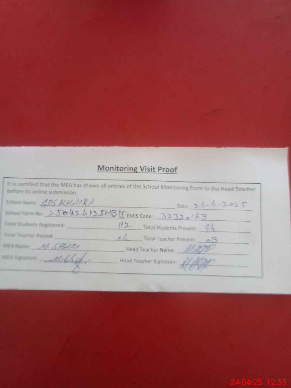 | Attendance Register | Head Teacher | MEA with School | Visit Proof |