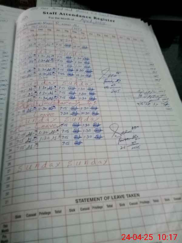 | CNIC | Full Name | Designation | R/C | Absence During Last Calender Month |