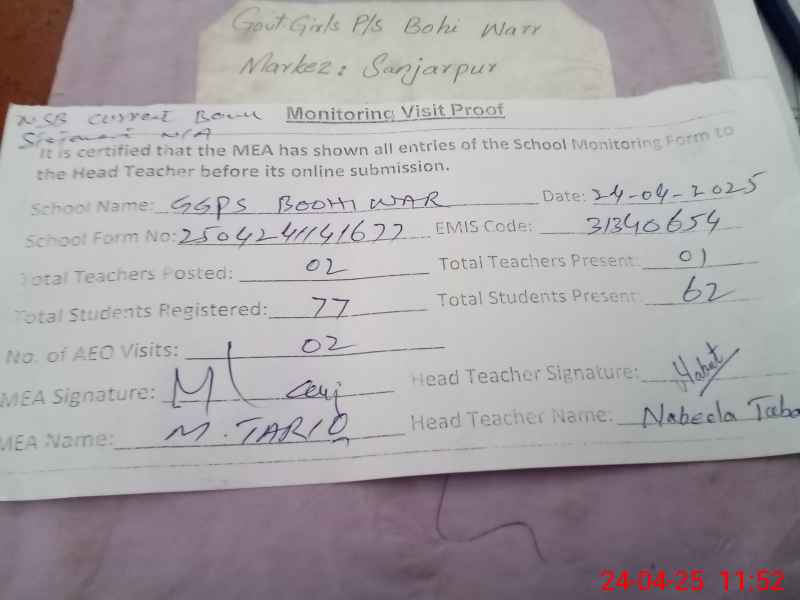 | Attendance Register | Head Teacher | MEA with School | Visit Proof |
