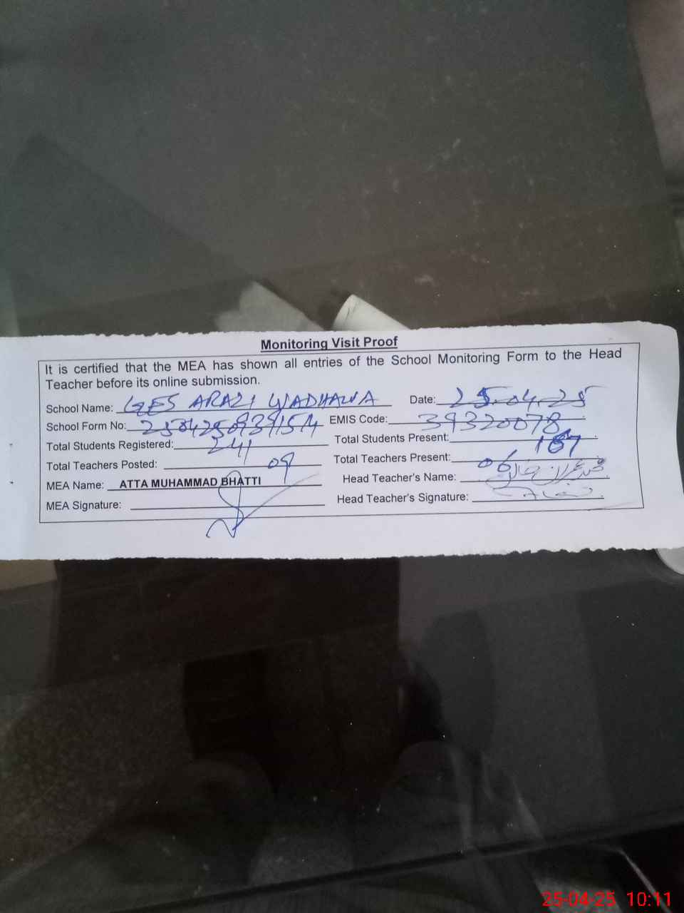 | Attendance Register | Head Teacher | MEA with School | Visit Proof |