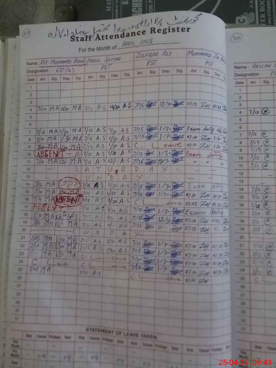 | CNIC | Full Name | Designation | R/C | Absence During Last Calender Month |