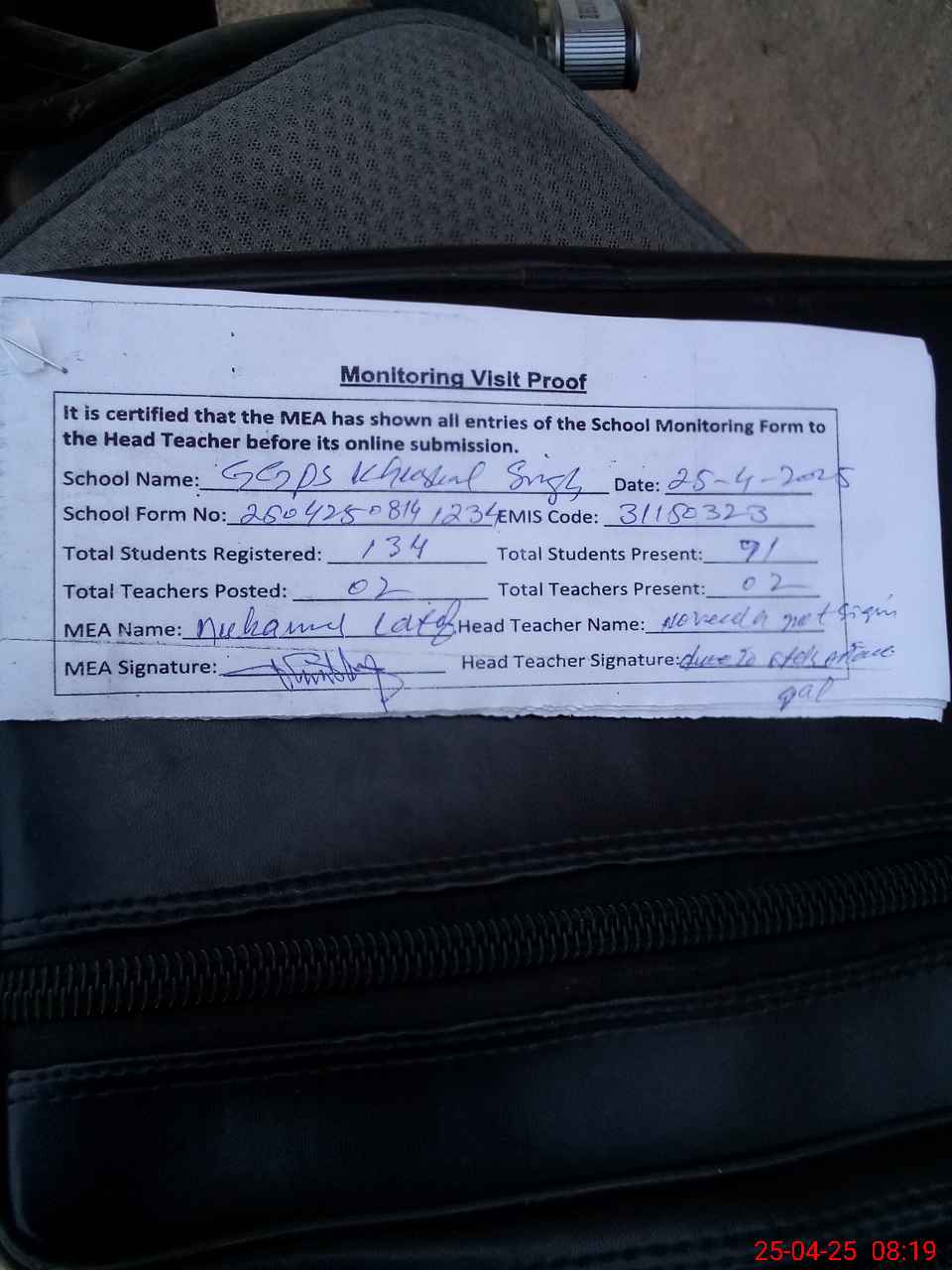| Attendance Register | Head Teacher | MEA with School | Visit Proof |