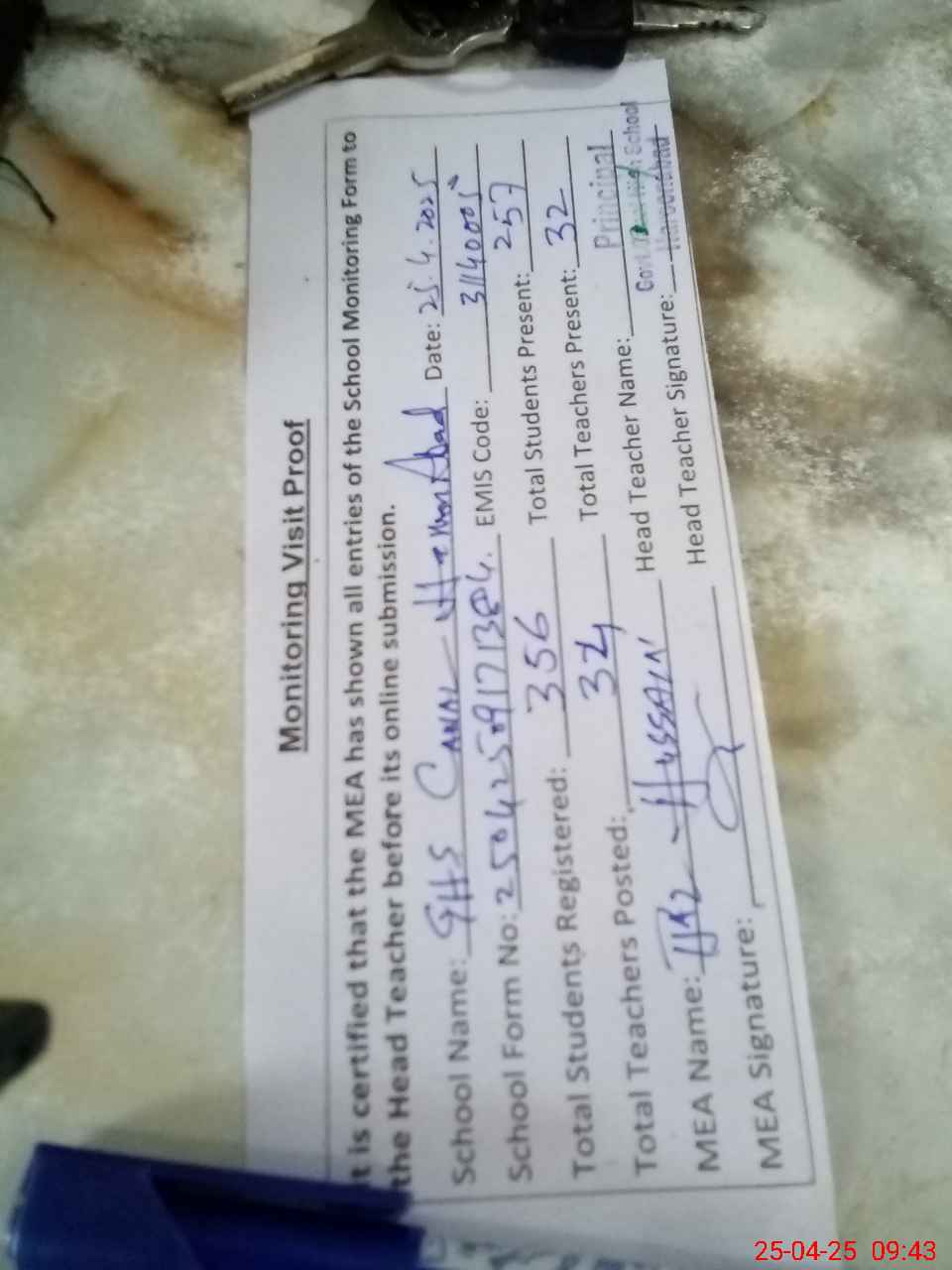 | Attendance Register | Head Teacher | MEA with School | Visit Proof |