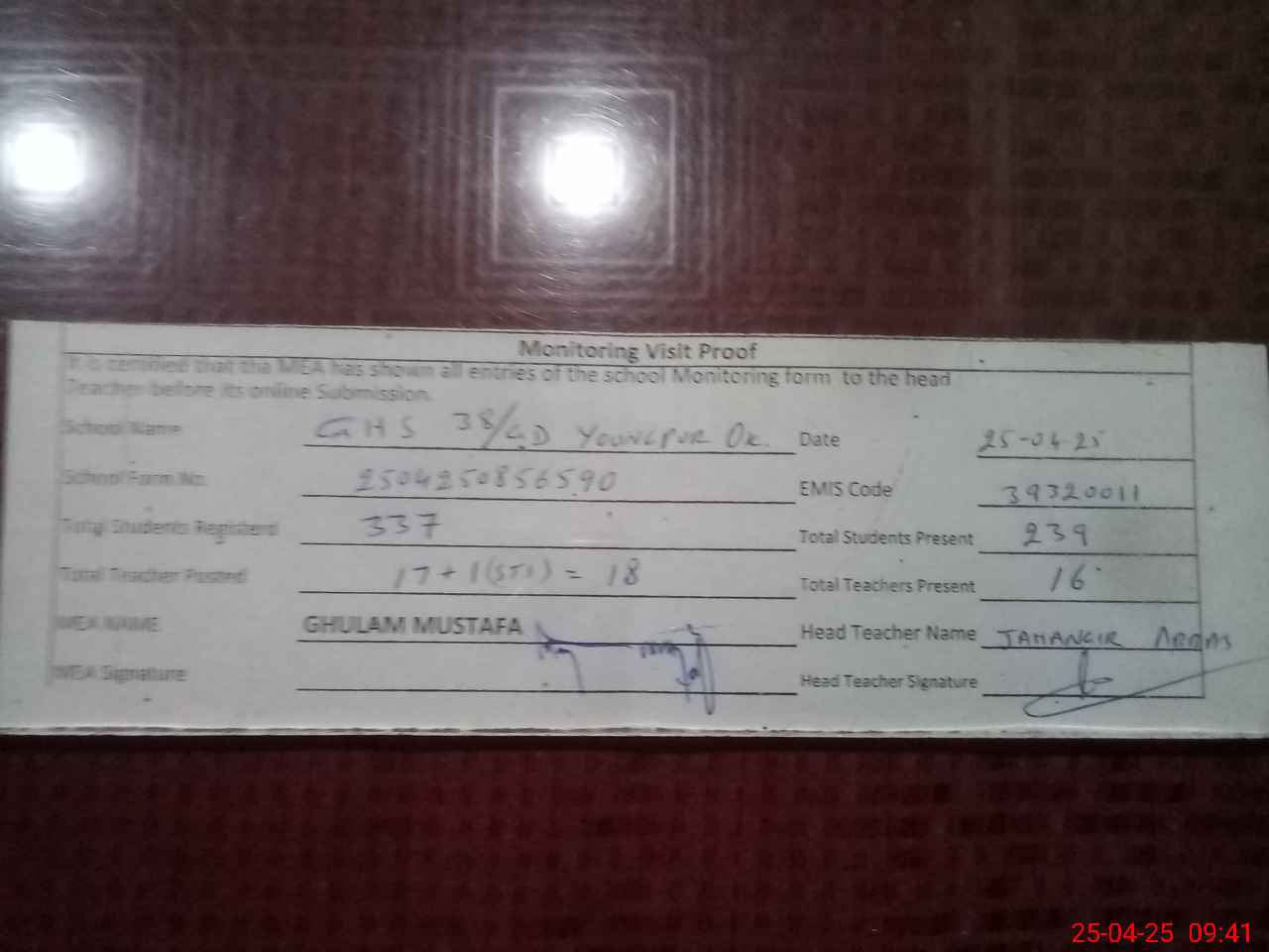 | Attendance Register | Head Teacher | MEA with School | Visit Proof |