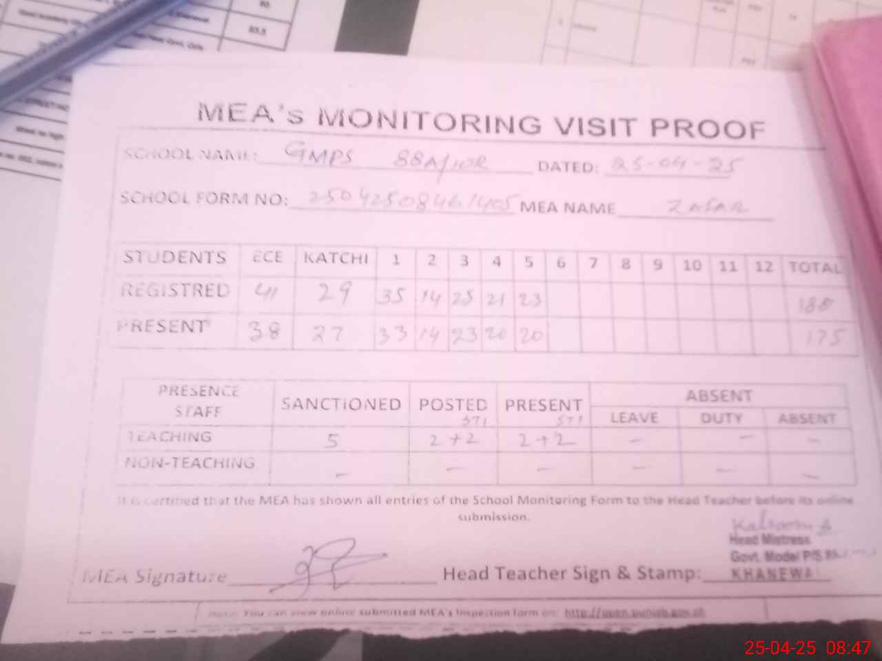 | Attendance Register | Head Teacher | MEA with School | Visit Proof |
