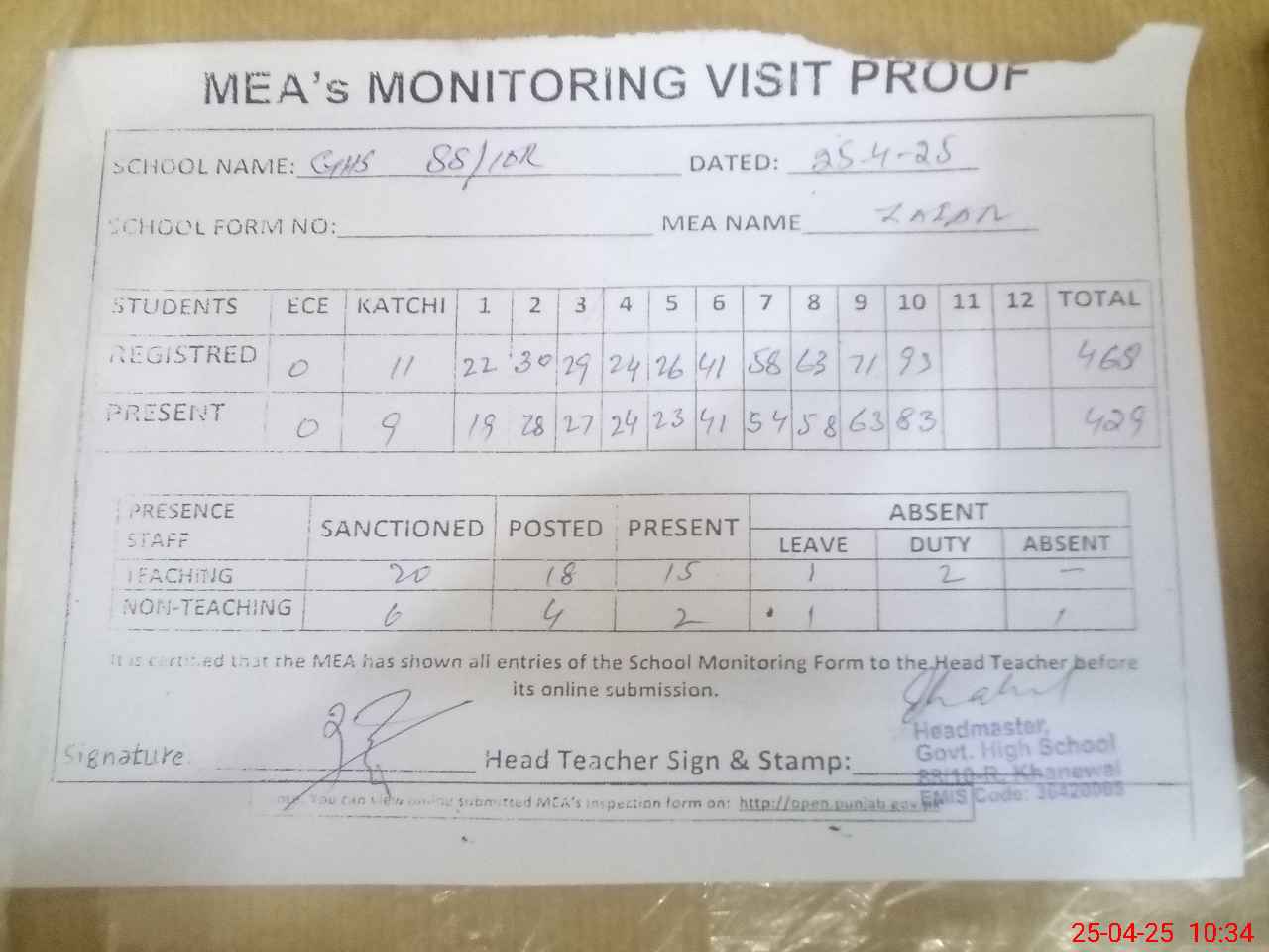 | EMIS Code: 36420065 | Name of School: GHS 88/10-R, KHANEWAL | |||