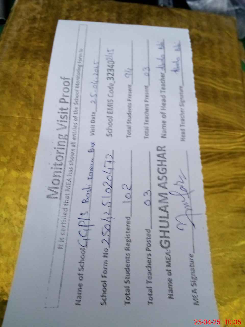 | Attendance Register | Head Teacher | MEA with School | Visit Proof |