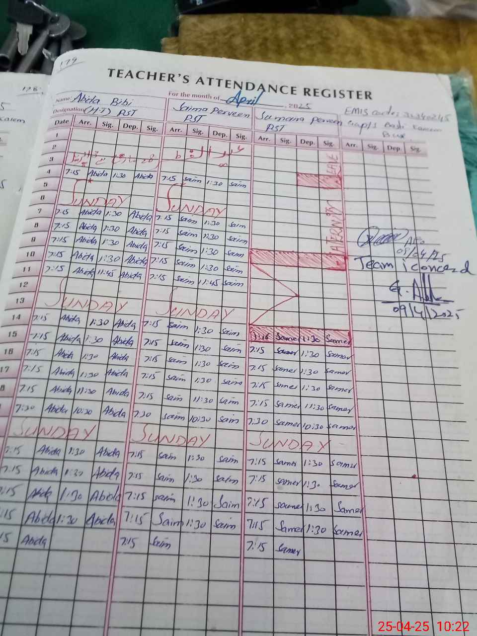 | CNIC | Full Name | Designation | R/C | Absence During Last Calender Month |