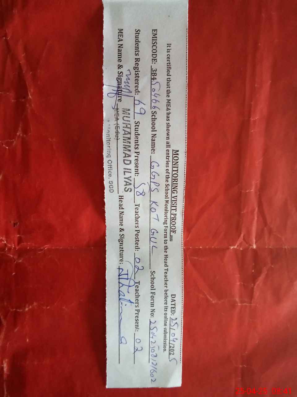 | Certified that this School was Inspected by the Undersigned MEA/DMO Today and the Information Stated Above is as Per Record. | |||||