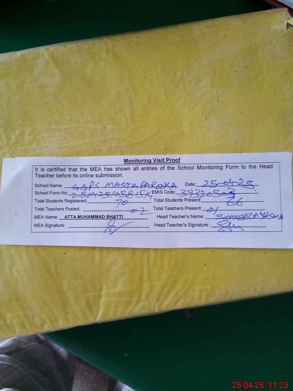 | Attendance Register | Head Teacher | MEA with School | Visit Proof |