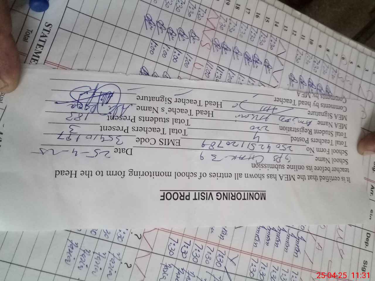 | Attendance Register | Head Teacher | MEA with School | Visit Proof |