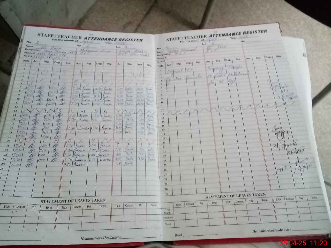 | CNIC | Full Name | Designation | R/C | Absence During Last Calender Month |
