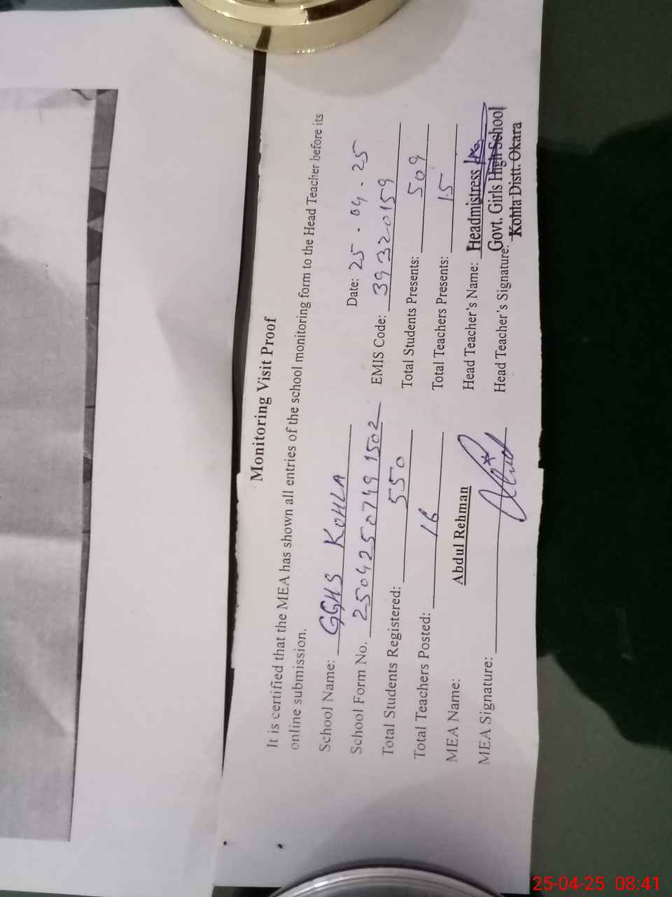 | Attendance Register | Head Teacher | MEA with School | Visit Proof |