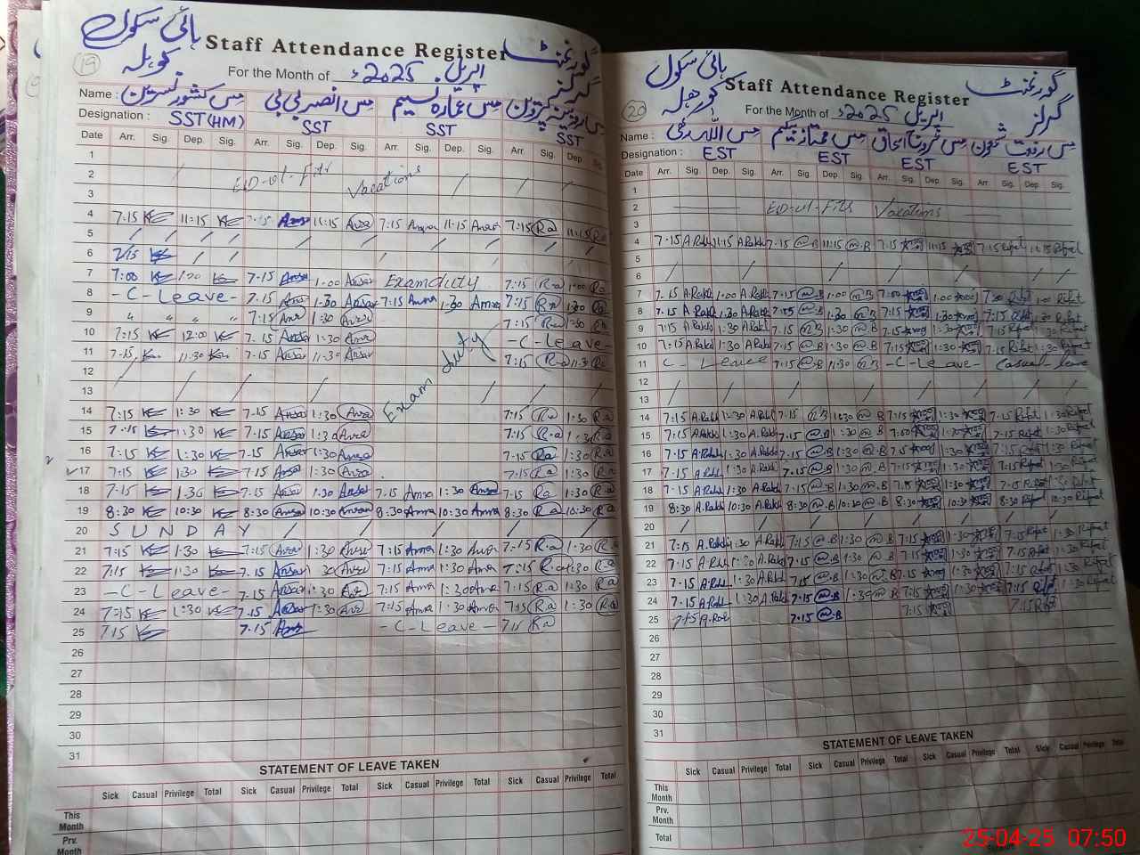 | Leave | Duty | Absent | Maternity | Medical | Ex- Pak |