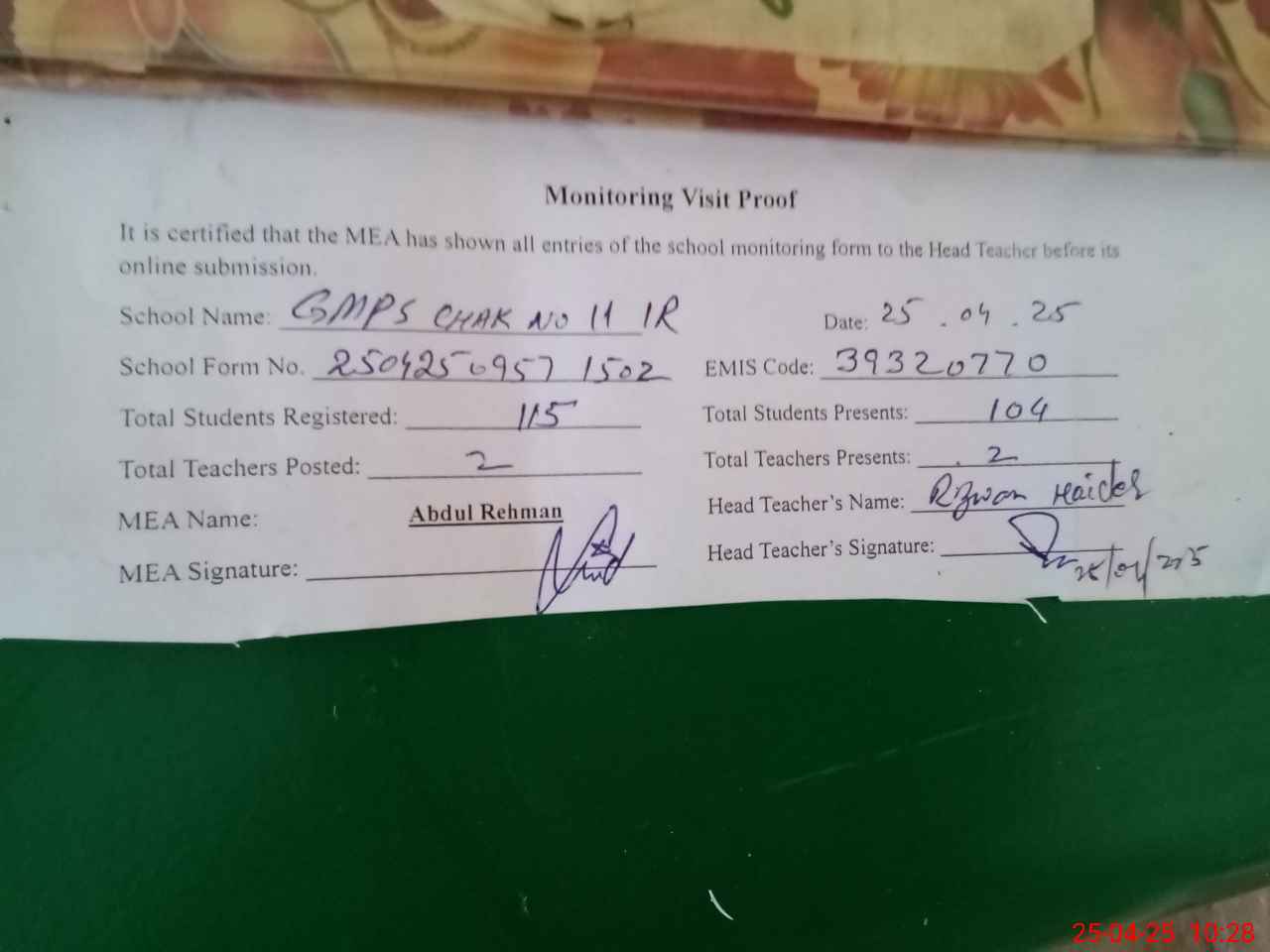 | Attendance Register | Head Teacher | MEA with School | Visit Proof |