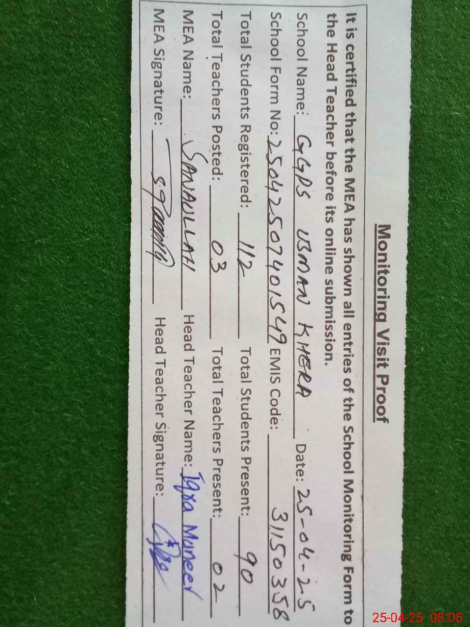 | Attendance Register | Head Teacher | MEA with School | Visit Proof |