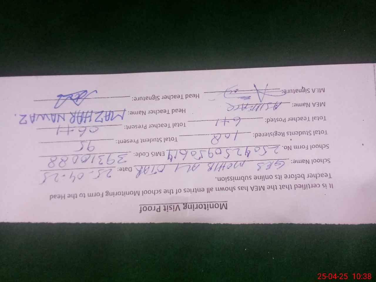 | Certified that this School was Inspected by the Undersigned MEA/DMO Today and the Information Stated Above is as Per Record. | |||||