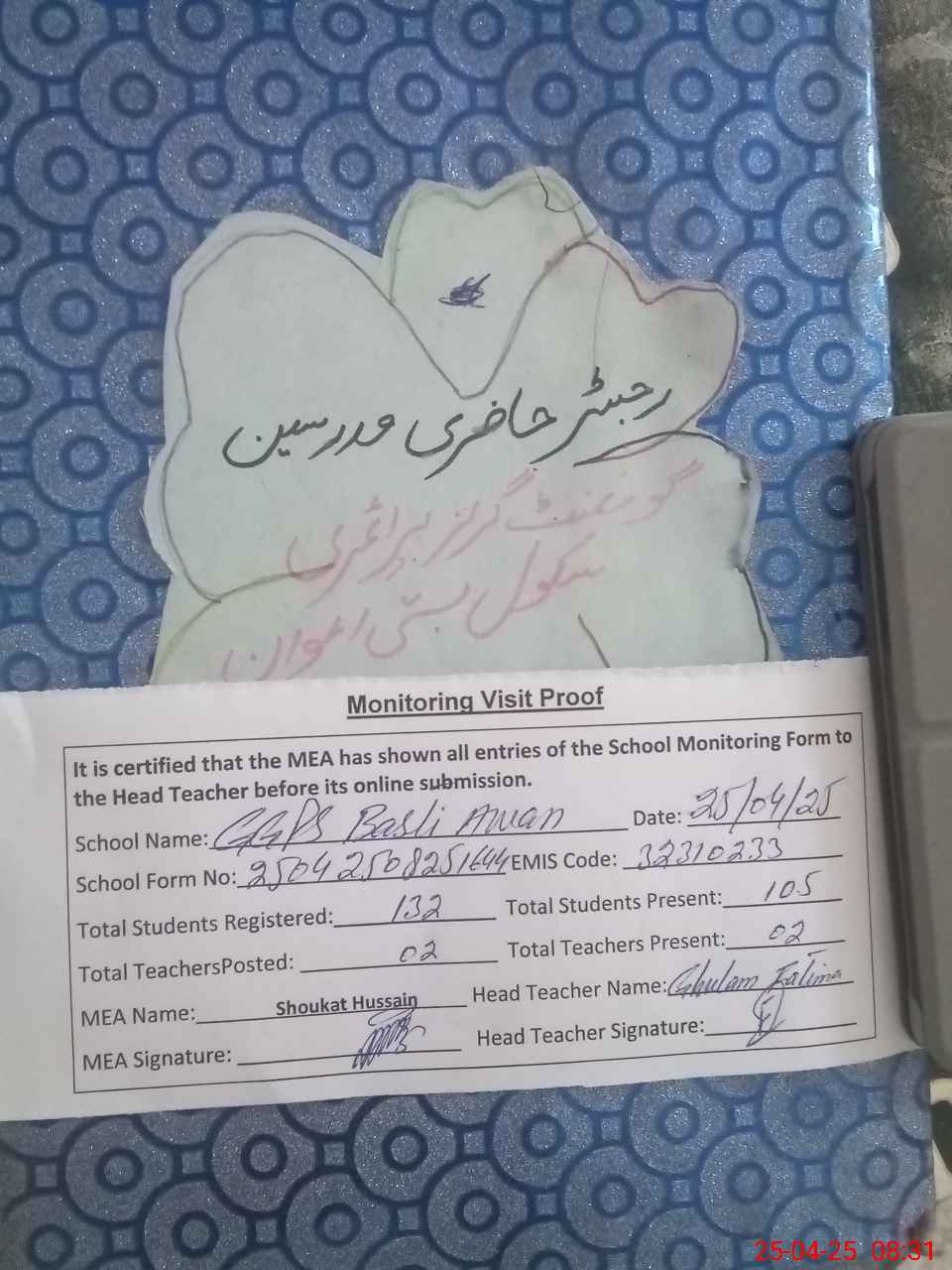 | Attendance Register | Head Teacher | MEA with School | Visit Proof |