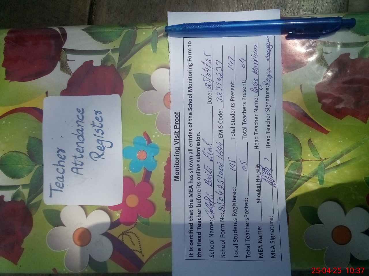 | Attendance Register | Head Teacher | MEA with School | Visit Proof |