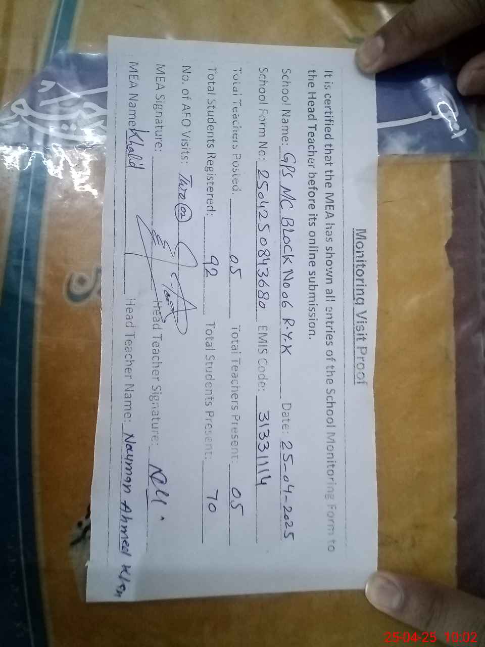 | EMIS Code: 31331114 | Name of School: GPS MC BLOCK NO. 6 RYK | |||