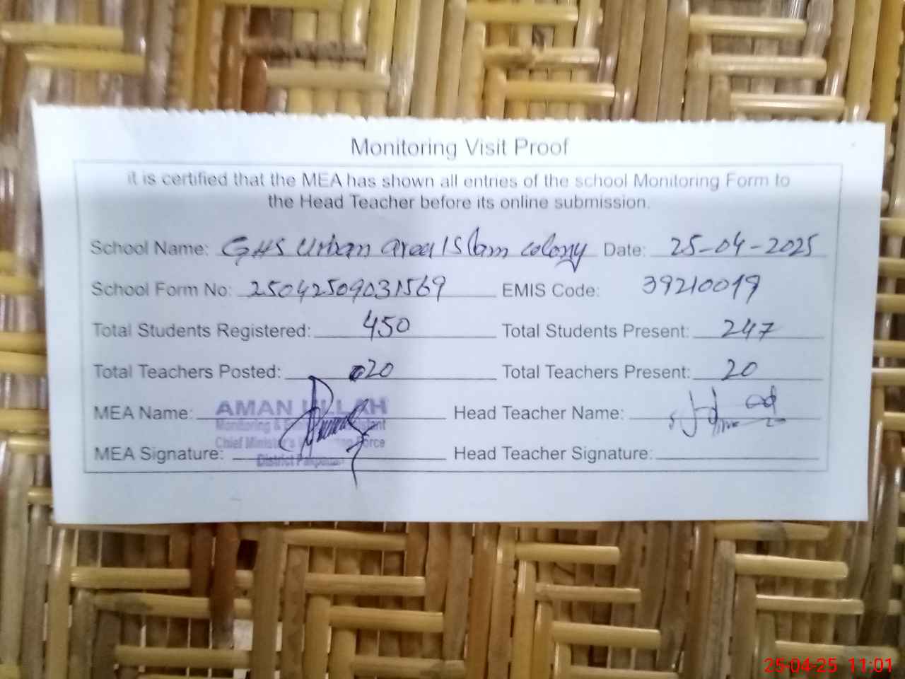 | EMIS Code: 39210019 | Name of School: GHS URBAN AREA ISLAM COLONY | |||