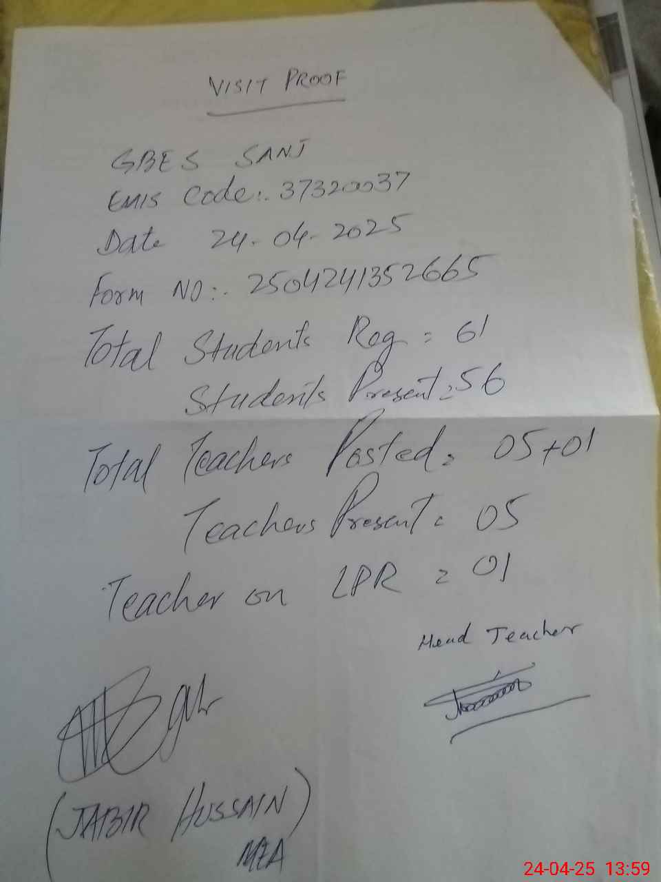 | Attendance Register | Head Teacher | MEA with School | Visit Proof |