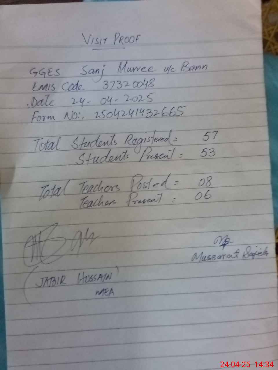 | Attendance Register | Head Teacher | MEA with School | Visit Proof |